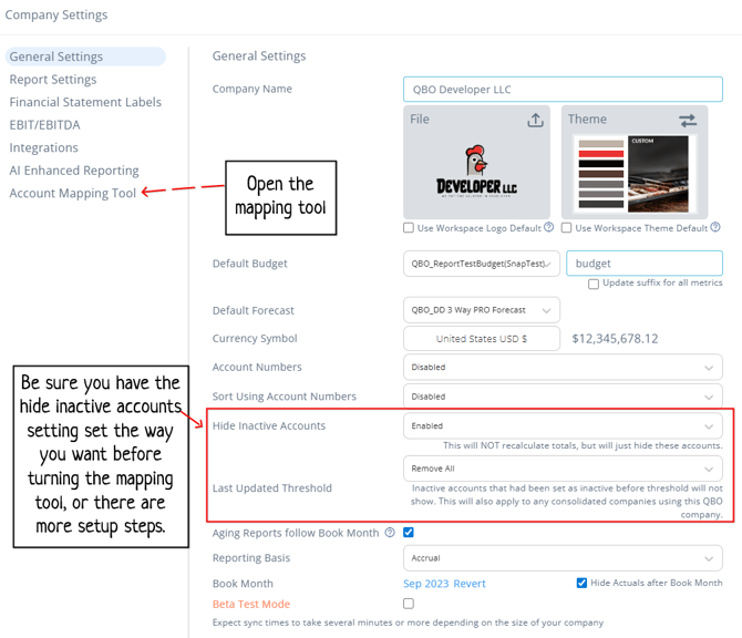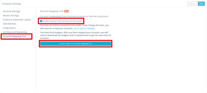 Tip: Remove all inactive accounts within the Mapping tool to hide them in budgets and statements. Regardless of the Company Settings, your customized COA mapping will not change until changes are made in the Mapping Tool.