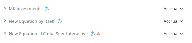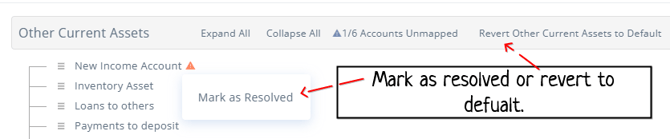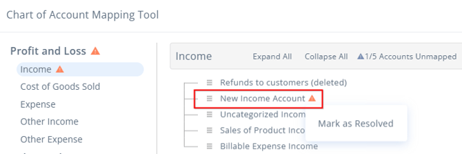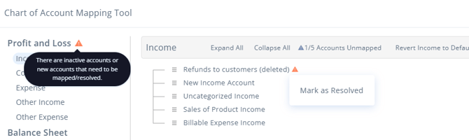 - If you decide to show inactive accounts after turning on the Mapping tool and removing inactive accounts, there will be an "unmapped" warning icon next to inactive accounts for you to Resolve
