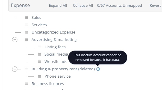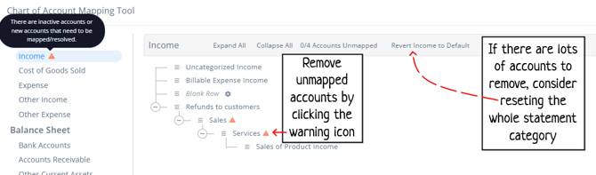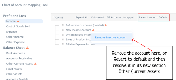 - These inactive accounts will show as unmapped. You can click to Remove them individually or Revert the COA to Default (for the selected accounting category)