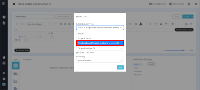 Open a dashboard or a report and quick build or create a new metric. When selecting data, you will see an option to select Actuals vs Budget/Forecast (relative to book month) as a column type.