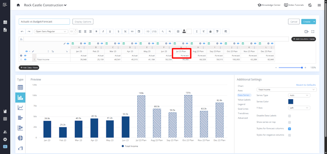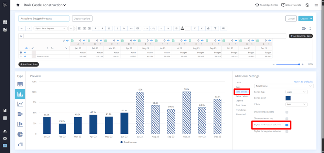 You can easily turn this on or off by going to the Additional Settings > Data Series section and checking or unchecking Styles for Forecast Columns. This feature is also available when using budget-only data.