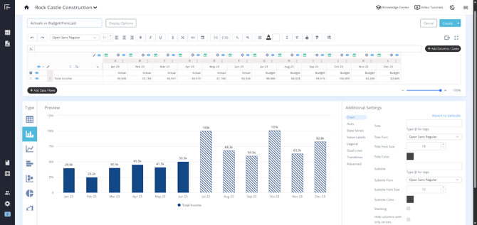 Another great feature of this data type is that when using charts, such as column charts, your budget/forecast data will be distinguished by a different style from your actuals.