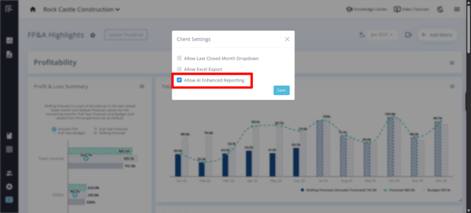 Once AI reporting is activated at the workspace level, navigate to the company's settings > AI Enhanced Reporting > turn on the AI feature. This granular control ensures that each company within your workspace can independently benefit from AI enhancements based on their specific needs and preferences. This feature is currently offered at no charge.