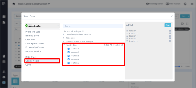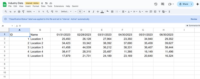 In this example, income from 5 different locations in the same industry is being brought into Reach through a Google Sheet import:
