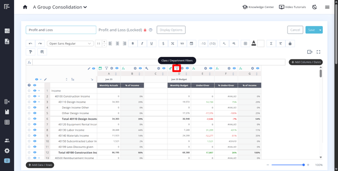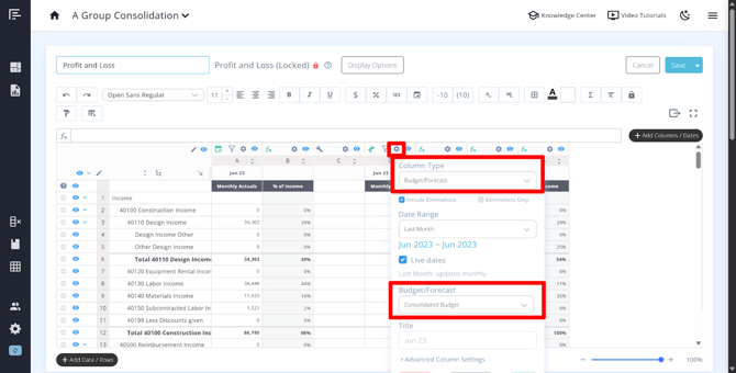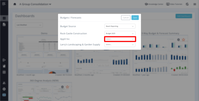 - Select the correct budget/forecast for each company in the consolidated company’s Budget/Forecast view