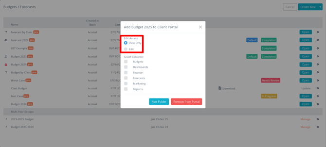 - Folder Organization: Organize your budgets and forecasts into folders for easy navigation
