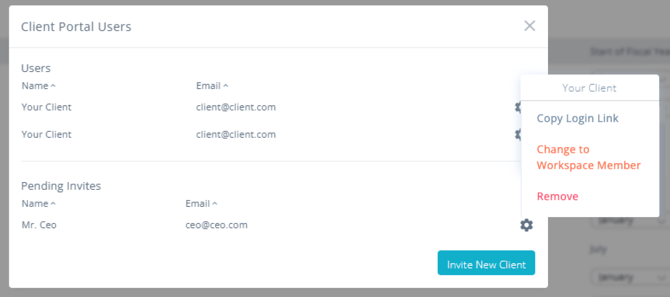 Find the gear icon next to the client's name and select the "Change to Workspace Member" option from the dropdown menu. This will initiate the process of converting the client into a user. It's important to note that this option will only be available if the client has already accepted the original invitation.
