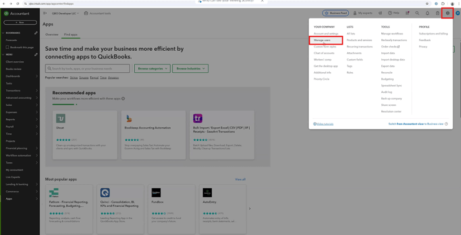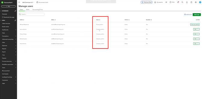 You will not be able to connect if you have “In-House Accountant” access. If you click on the gear icon in the top right corner of QuickBooks and then click on “Manage users” under “Your Company”, you will want to see if it says “Admin” under the “Role” column. If your role is set to “Admin”, you will be able to connect your company to Reach. Additionally, if you are listed under “My Accountant” in the left-hand menu, you will have access to connect your company with Reach.