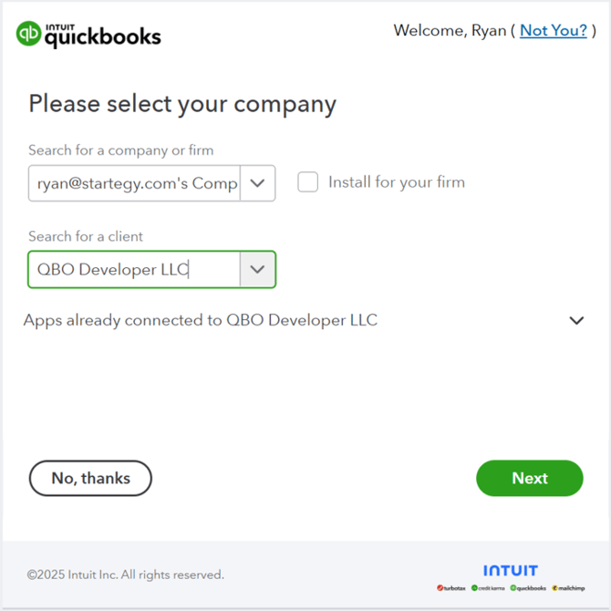 To connect a QuickBooks Online company, within the software, click on "Add Company" and then choose QuickBooks Online. Then you will need to log in to your Intuit account to authorize. You will see the below popup for authorization.