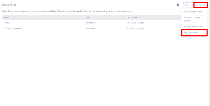 - Data Sheets: Data Sheets created at the company level can be saved as a template and can then be applied to the consolidation
