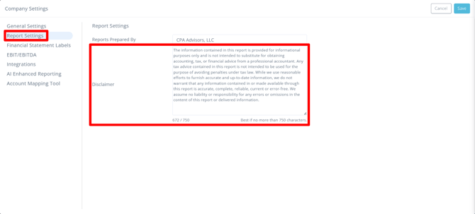 You can set up a default disclaimer that can be used across all your reports and statements. This disclaimer can be up to 750 characters and is useful for providing additional information or legal notices.
