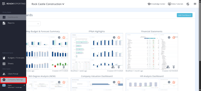 - Open the company and click the gear icon in the lower left to access Company Settings.