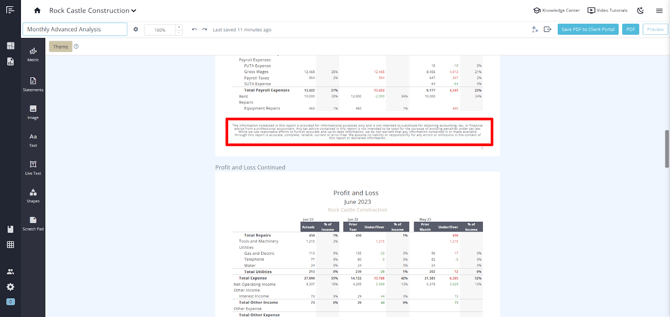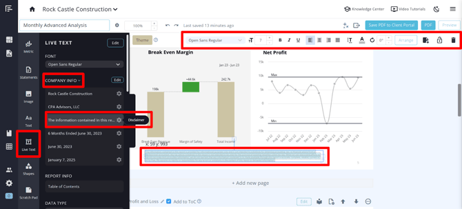 You can also add a disclaimer to a report page using the live text feature. The live text disclaimer will automatically update in the report if you make any changes to the disclaimer in the Company Settings.