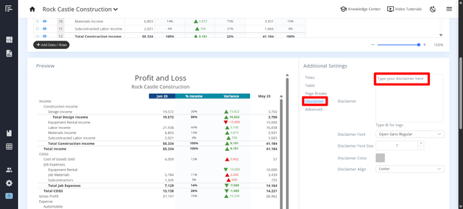 You can add a disclaimer directly to any financial statement, which will appear at the bottom of each page of the statement.