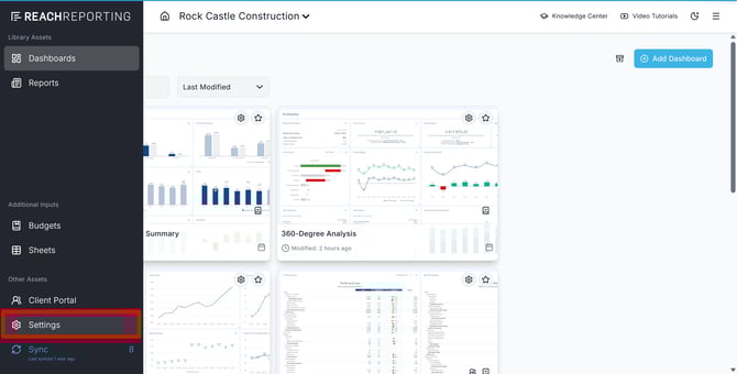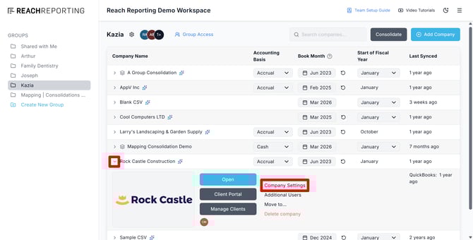 To configure EBITDA in Reach Reporting, start by navigating to the company settings, which can be accessed either from the workspace home or directly within your company.