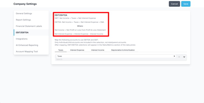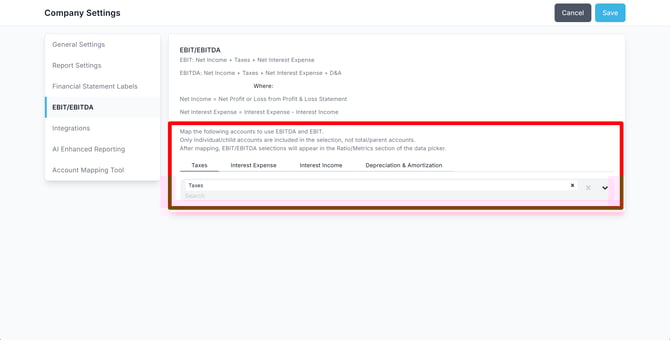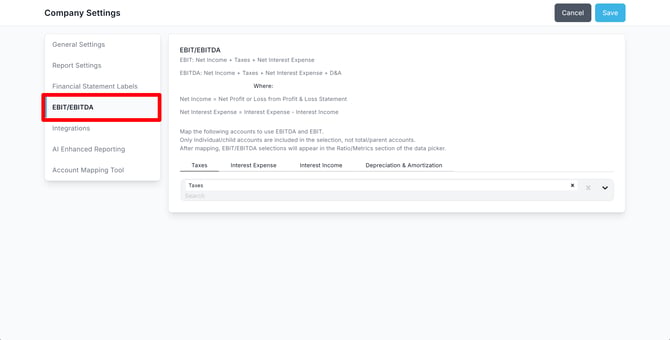 Once inside the settings, you'll notice an EBIT and EBITDA tab where you will find options for selecting the accounts relevant to your EBITDA calculation.