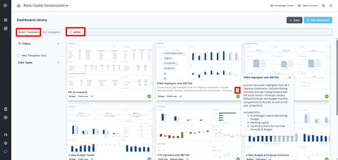 You'll find that some of the dashboards and reports include EBITDA metrics. You can also hover over the template descriptions to see the included metrics when generating dashboards and reports.