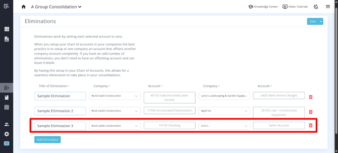 Eliminations are used when wanting to zero out intercompany accounts. Reach Reporting will zero out any accounts added as an elimination.