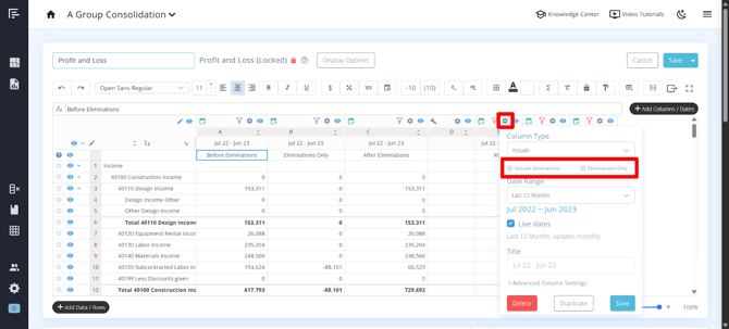 You can toggle whether you want to include the eliminations, ignore the eliminations, or show the amount being eliminated by editing the metric or statement, and toggling the boxes in the column settings: