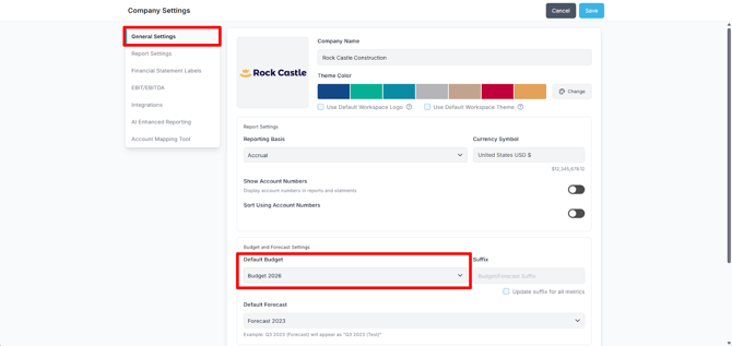 To set a QBO or Xero budget as your default so that all templates using budget data reference it automatically, go to Settings > General Settings and select it as the Default Budget.