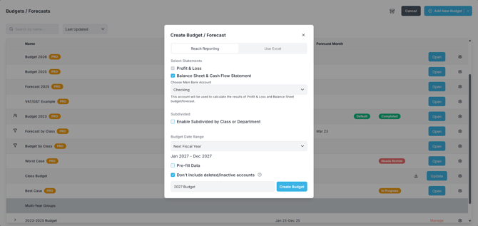 - Select the financial statements to include in your budget. To build a full three-way budget, select Profit & Loss, Balance Sheet, and Cash Flow Statement.