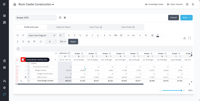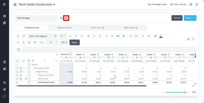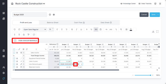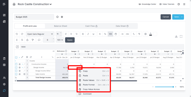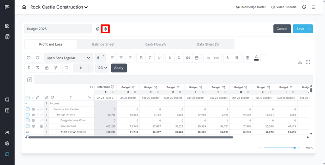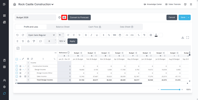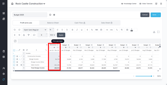 Each financial statement includes a grayed-out reference column that pulls in your prefill period data. This column stays visible as a reference point, allowing you to compare your budget values against historical actuals and track variance as you build.