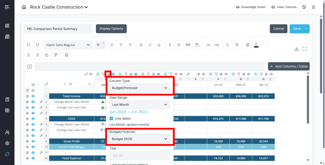 To use a QBO or Xero budget in a specific metric or statement, click the gear icon above a column, change the column type to Budget/Forecast, and select the budget you want.