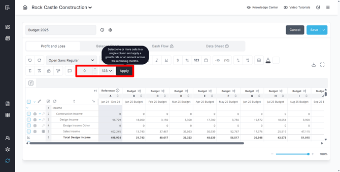 - If you prefill, you can apply a growth rate, which will automatically apply to your entire P&L. The Balance Sheet will prefill using the final month's actuals.