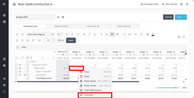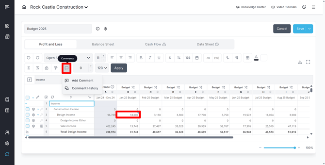 - Right-click and add comments to document the reasoning behind your numbers. Comments will be marked with a blue flag, and you can view comment history using the comment icon at the top tool bar.