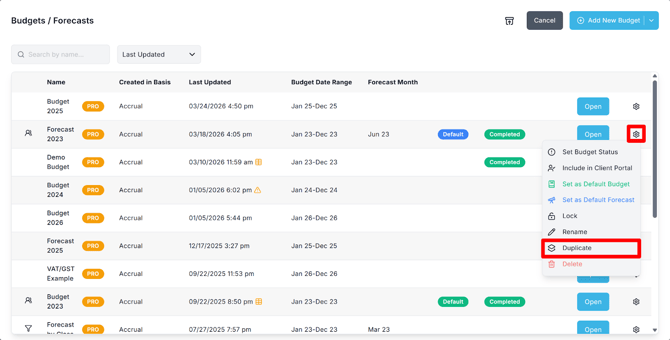 If you want to reuse an existing budget's structure, customizations, or drivers — for example, when rolling into a new fiscal year — you can duplicate it rather than starting from scratch if it was created using Budgets PRO.