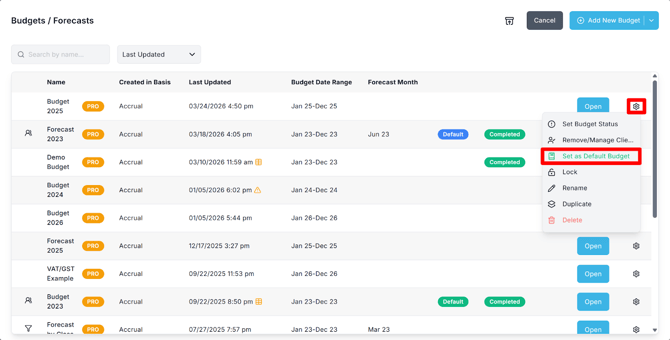 You can also set a budget as default by clicking the gear icon next to the budget in the Budgets/Forecasts list and selecting Set as Default.