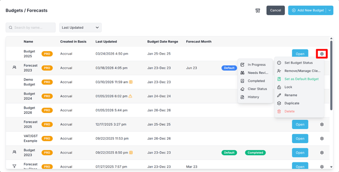 After saving and closing a budget, you can manage it further by clicking the gear icon next to the budget name in the Budgets/Forecasts list. Options include: