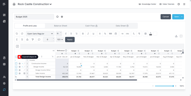 - Click the arrow icon at the top left to collapse all rows and quickly review group totals, then expand or collapse any group as needed. Totals update automatically whenever budget values change.