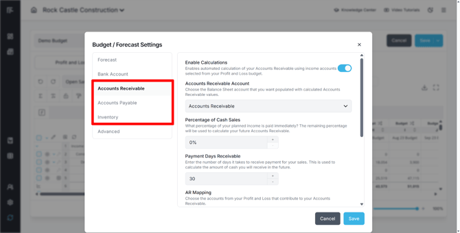 Click the settings gear icon to configure automated calculations for Accounts Receivable, Accounts Payable, and Inventory. When enabled, the system automatically calculates expected cash inflows and outflows based on your payment terms, removing the need for complex formulas.