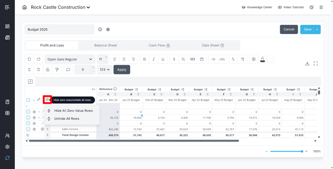 - Click the eye icon to hide with zero values or unhide all rows, helping you focus on relevant accounts.
