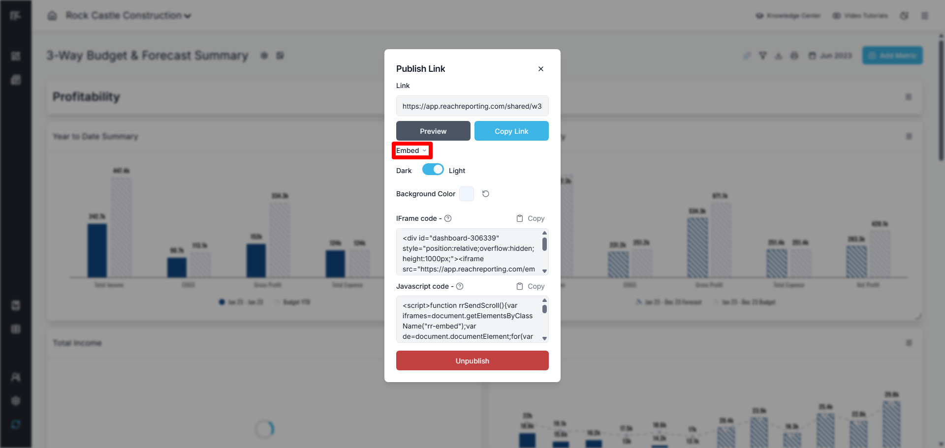 Embed: Create an embedded link for integrating the dashboard into websites or other platforms