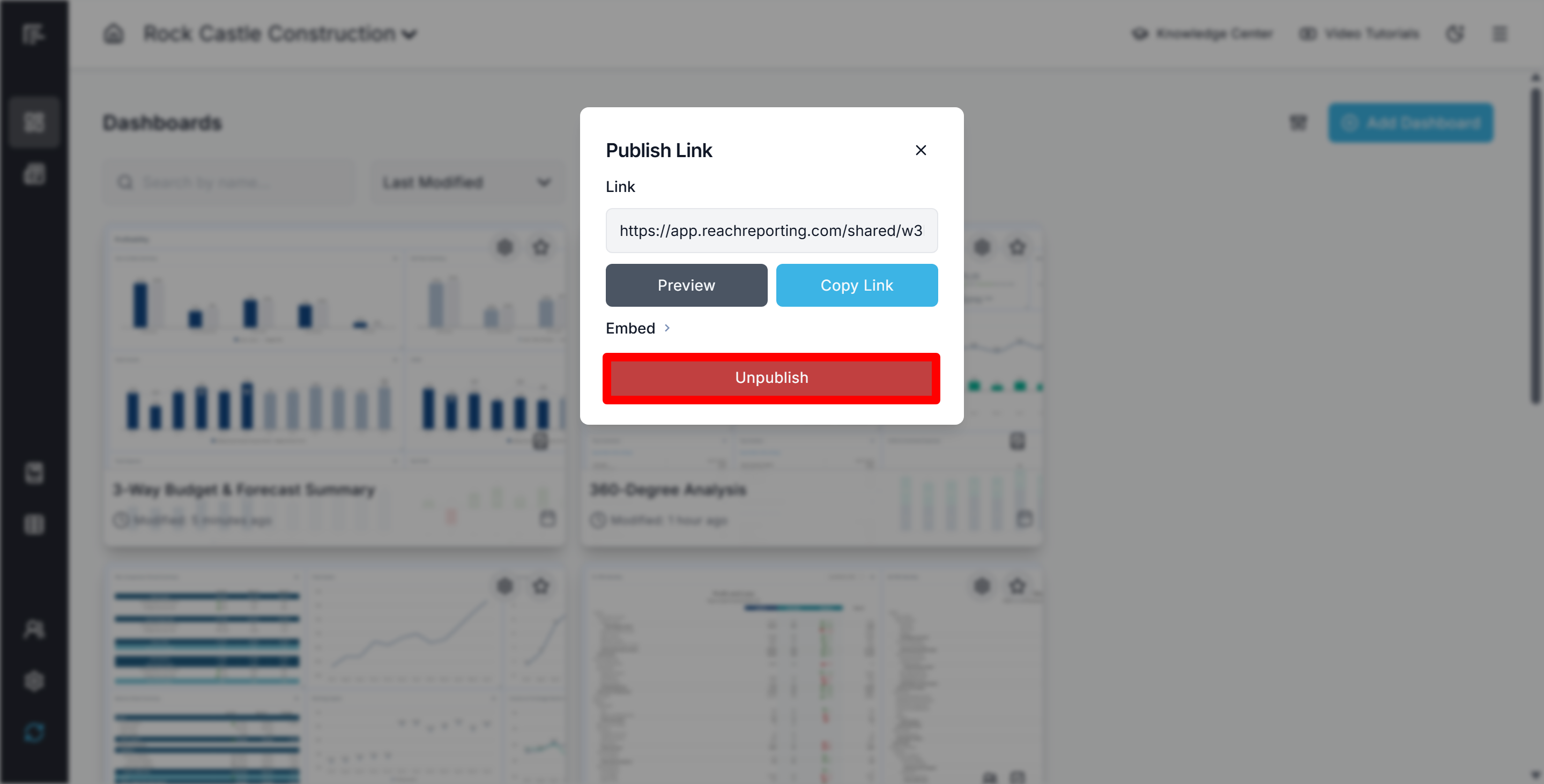 Unpublishing a dashboard immediately removes access for all viewers, whether they were accessing it through the Client Portal or via shareable links.