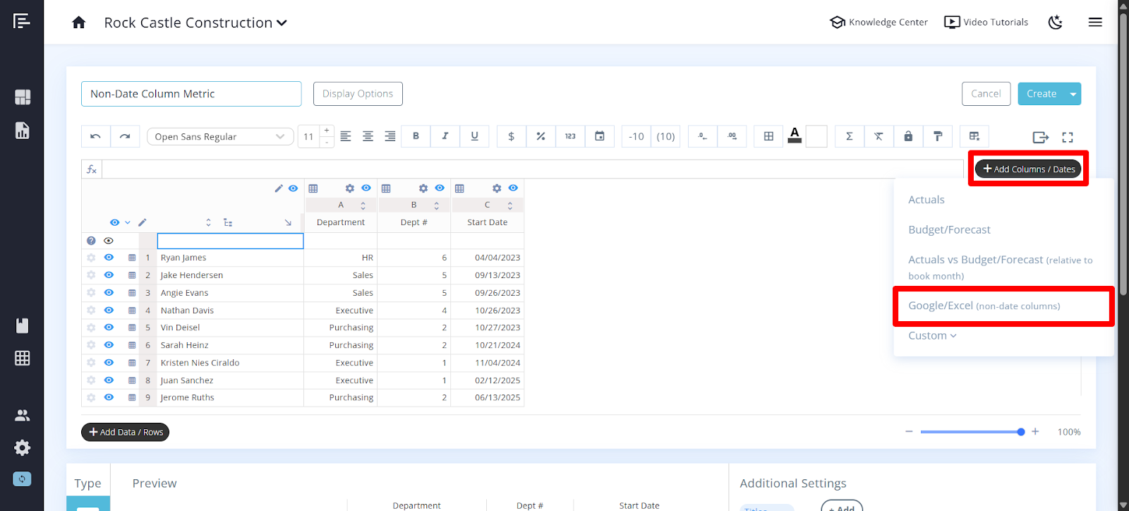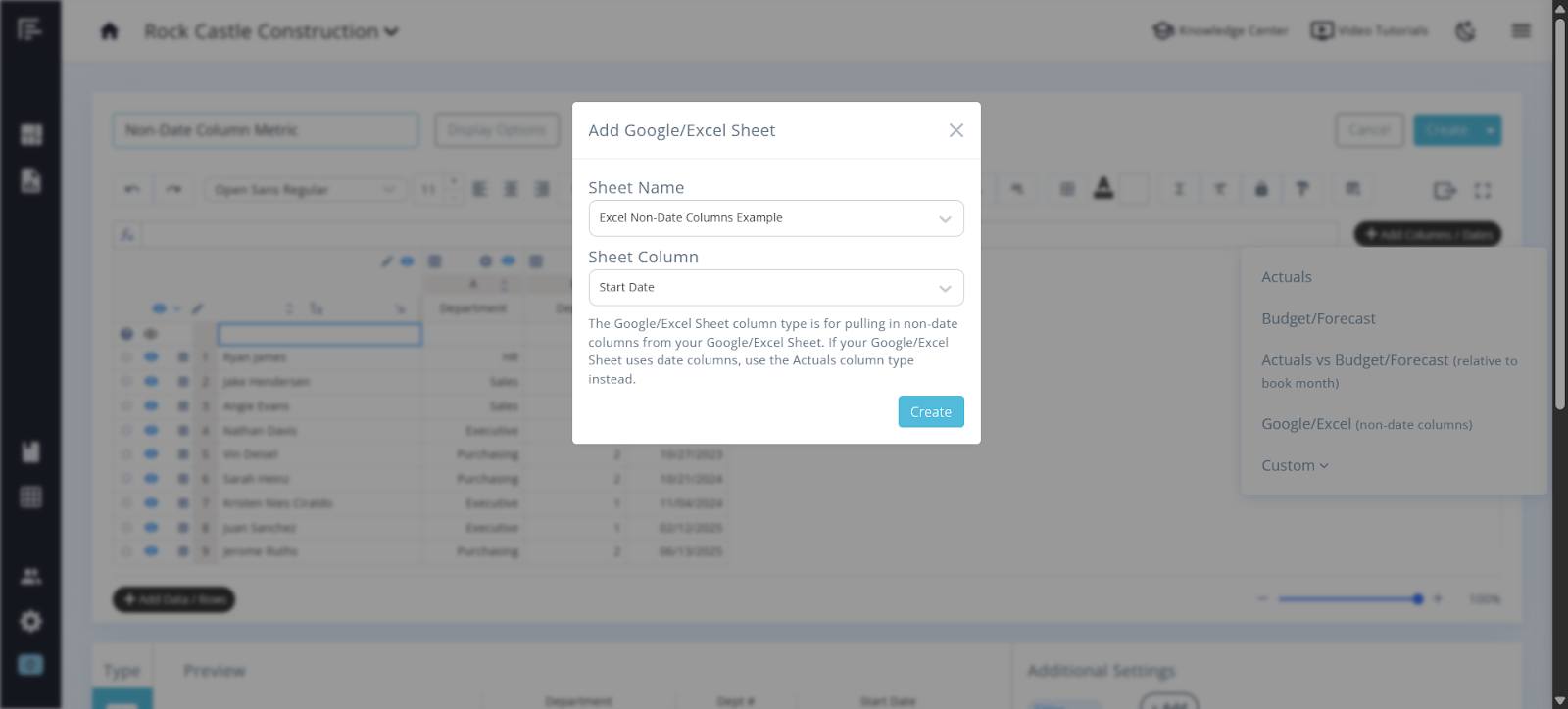 Click on the "Add Columns/Dates" button and choose the Excel Sheet (non-date columns) option from the drop-down menu. Then, select the Excel Sheet and the specific column from which you want to pull data.