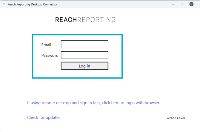 Note: New versions of the Reach Reporting Desktop Connector are released periodically and update automatically in most environments. However, if you are using Rightworks, you will need to contact their support to manually update the connector when new versions become available.
