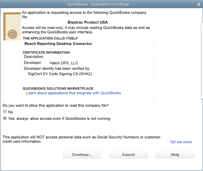 Intuit will prompt you to authorize the connection to Reach Reporting. We recommend selecting "Yes, always..."