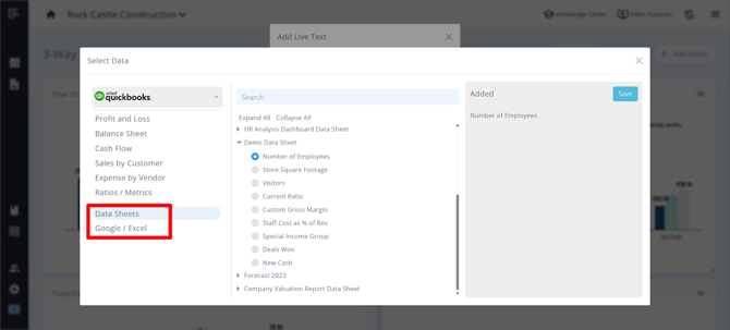 Select Add Metric > Live Text > Data > Select data from Data Sheets, Google, or Excel.