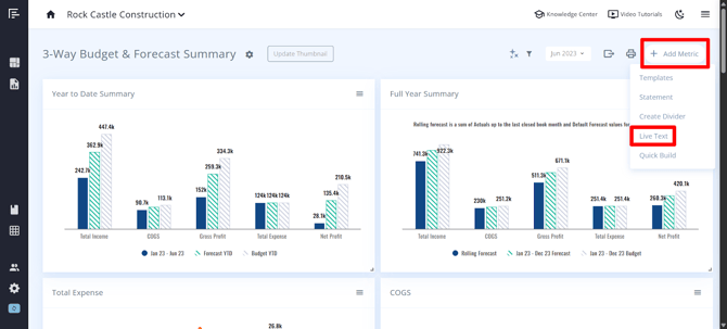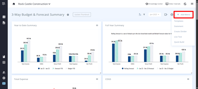 To add a metric, select “Add Metric” and then choose from Templates, Statements, or Quick Build. You can also create Dividers or add Live Text to your dashboard.
