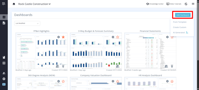 You can add a new dashboard if you have built and saved one as a template.  Or you can access some pre-built templates, create a custom dashboard from scratch, or generate a dashboard using our AI tool.