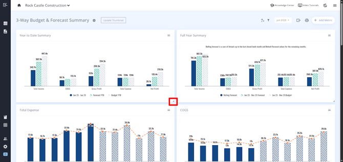 To adjust the size of a metric, hover over and then select the drag icon in the lower right corner of the metric.