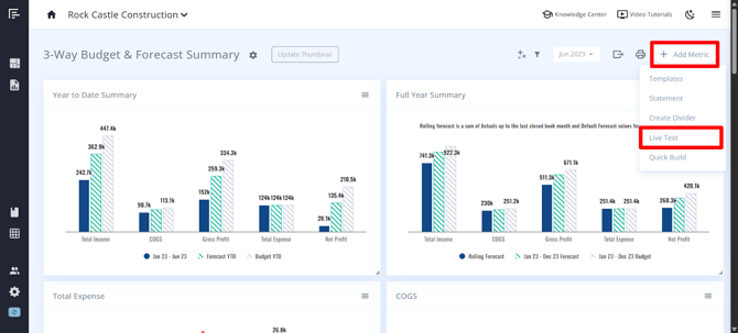 To add Live Text in a dashboard, click Add Metric > Live Text.