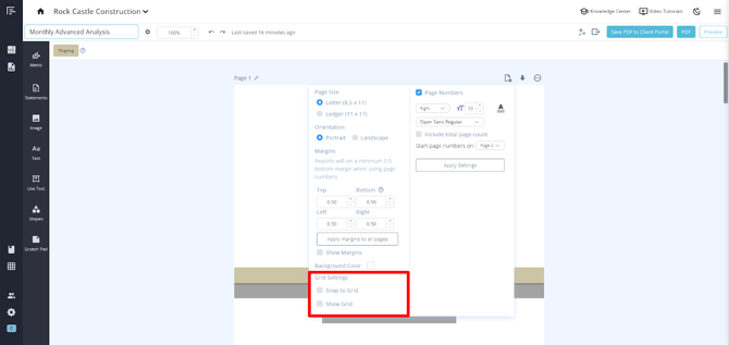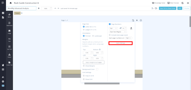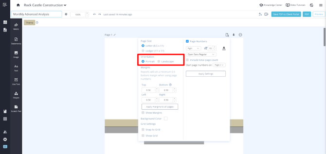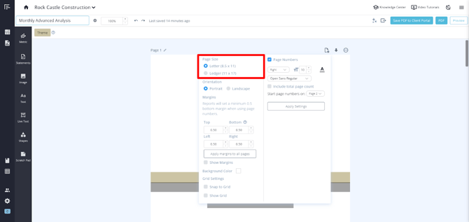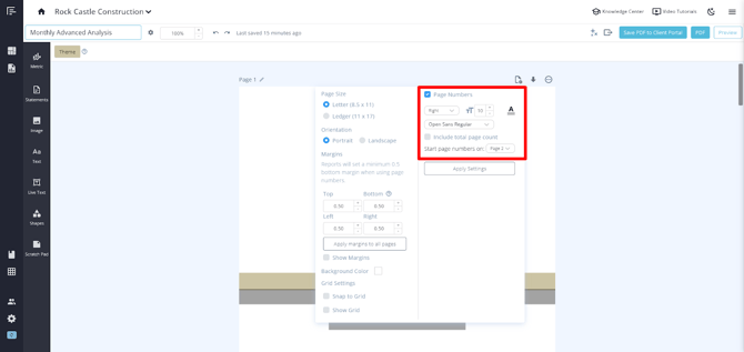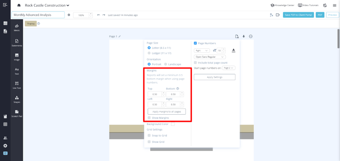Page settings allow you to customize the layout and appearance of individual pages within your reports. To access these settings: