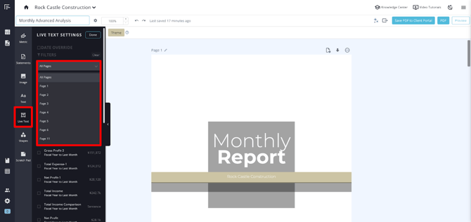 Note about Live Text: When editing Live Text settings, the page numbers in the Live Text editor always refer to the actual page position in the report (first page = Page 1), not where your page numbering starts. For example, if you set page numbers to start on Page 3, the Live Text editor will still call that first page "Page 1."