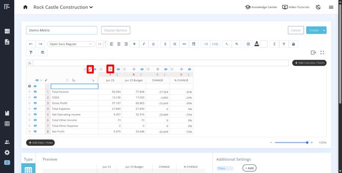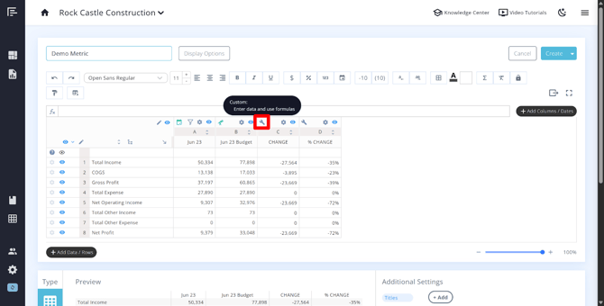 Eye Icon – This is used to hide individual rows from the final published metric or statement. Each row has its own eye icon, giving you granular control over what is visible to viewers. A white eye denotes a hidden row, and a blue eye denotes a visible row.
