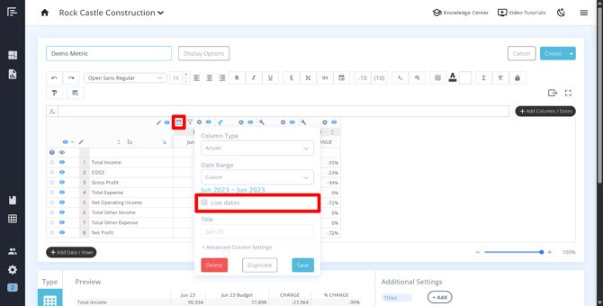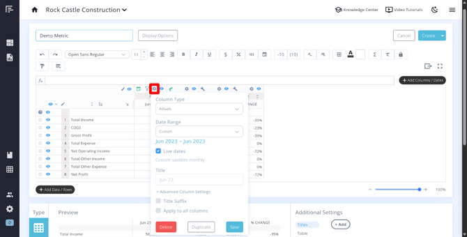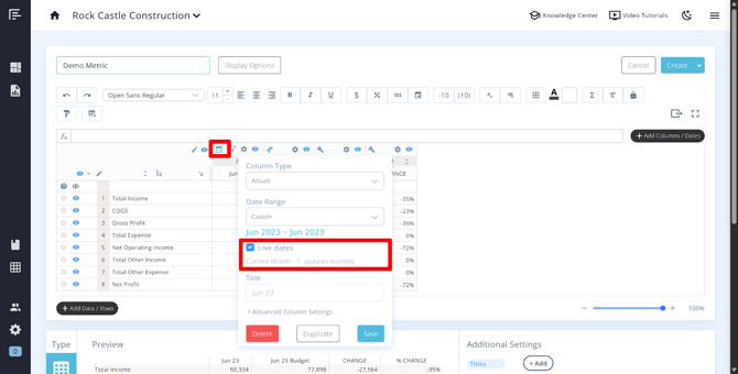 - Override the title – The column date range will automatically populate as the header for columns that have Live Dates turned on. You can override the title to customize the column header text in the Title setting.