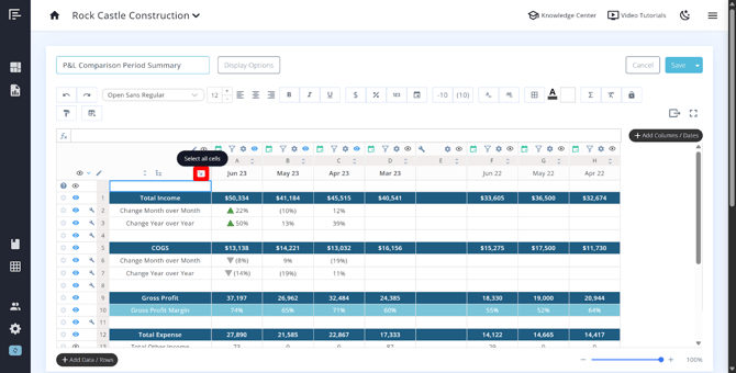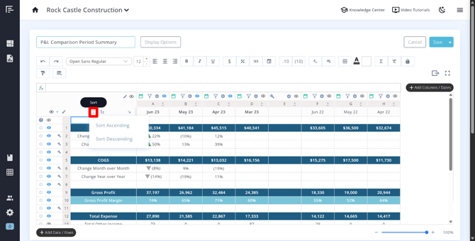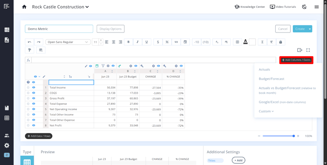 - Change the data type – Switch between actuals, custom, budget/forecast, actuals vs budget/forecast (relative to book month), or Google/Excel (non-date columns) .